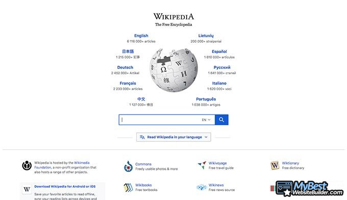Vì Wikipedia được sử dụng phổ biến nhất để tra cứu một số thông tin, nên thanh tìm kiếm nằm ngay chính giữa trang. Website cũng có thiết kế đơn giản và chào đón.