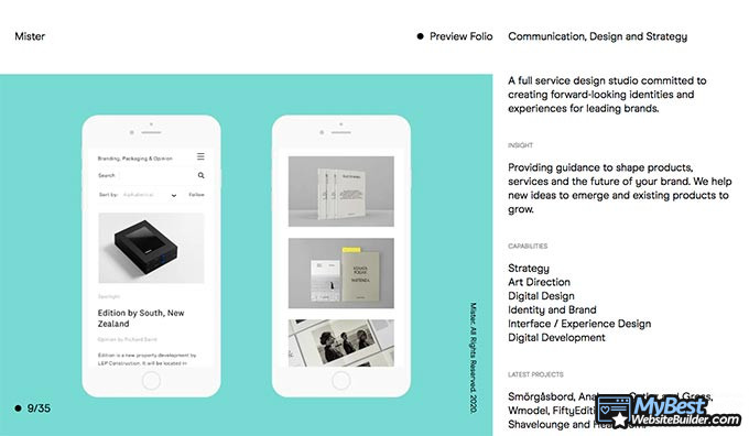 mister.studio cực kỳ đơn giản và dễ hiểu - thật lòng mà nói, tất cả những gì bạn nhận được là một trang duy nhất để xem một số thiết kế và để đọc về thương hiệu đằng sau chúng. Mặc dù nó có thể là một lựa chọn có chút táo bạo, nhưng nó thực sự rất mới mẻ, vì các trang web portfolio tốt nhất có xu hướng được tải với nhiều trang để sử dụng.