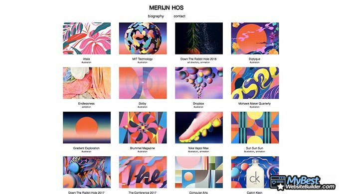 Một trang web có đầy đủ các thiết kế minh họa khác nhau, merijnhos.com cung cấp một bố cục hình ảnh rất rõ ràng và đơn giản. Khi bạn nhấn vào một trong các hình thu nhỏ, bạn sẽ được chuyển hướng đến một trang riêng có chứa một số thông tin (và ví dụ) của thiết kế đó. Chắc chắn là một trong những ví dụ trang web portfolio tốt hơn!