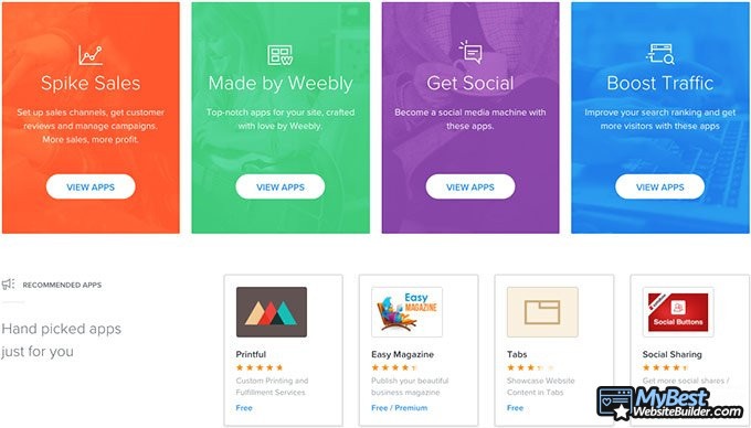 Bạn có thể tìm các ứng dụng được chọn thủ công cho mình và chọn từ danh sách được cung cấp hoặc tìm các ứng dụng được chia thành các danh mục khác nhau, như Thương mại điện tử, truyền thông, tiếp thị, xã hội, website, công cụ & tính năng. Điều quan trọng cần đề cập trong hướng dẫn cách sử dụng Weebly này là không phải tất cả các ứng dụng đều có thể truy cập được đối với các thành viên miễn phí, một số trong số chúng chỉ có sẵn cho người dùng trả phí.