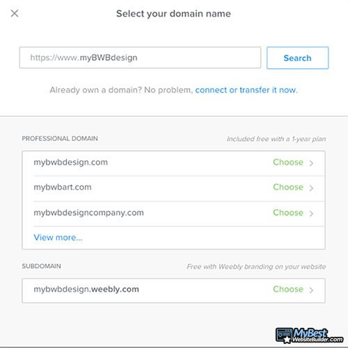 Bây giờ, nếu bạn đã có một tên miền, bạn có thể chọn kết nối hoặc chuyển nó ngay lập tức. Tuy nhiên, nếu không, bạn có thể chọn từ danh sách các tên miền có sẵn mà Weebly đang cung cấp.