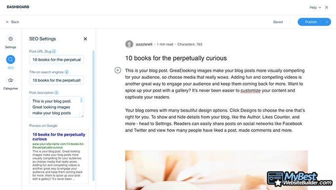 Wix có chức năng SEO - nó có thể được truy cập bằng cách điều hướng đến phần "Site" trên trang chủ của bạn và trải qua một số cài đặt nâng cao. Bạn có thể tập trung vào slug, tiêu đề SEO và thậm chí xem trước giao diện của nó trên Google - khá tuyệt vời!