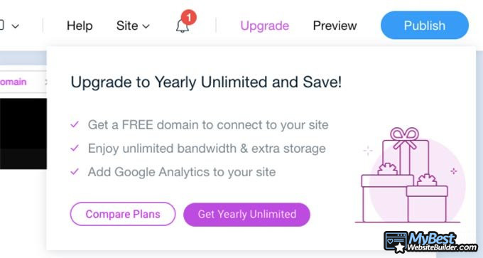 Trên trang chủ của bạn, chỉ cần cuộn lên nút "Upgrade" (Nâng cấp) ở góc trên bên phải màn hình và bạn sẽ được cung cấp tùy chọn để xem và kiểm tra các gói giá của Wix, so sánh và đối chiếu chúng.