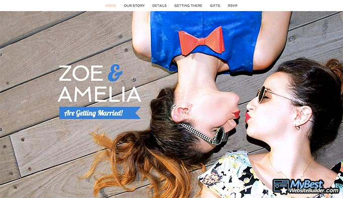 Zoe & Amelia tự hào có một website cưới vui vẻ. Nền tảng này hoàn toàn không lạ mắt và không có bất kỳ chi tiết tương tác nào, nhưng vẫn là một trong những mẫu website cưới tốt hơn, chủ yếu là vì sự đơn giản của nó.