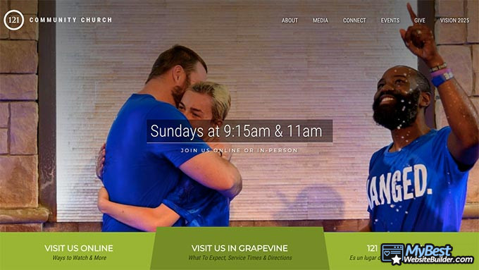 Trong khi nhiều website nhà thờ sử dụng các video giới thiệu trên trang chủ của họ, 121cc.com thực sự có một bức ảnh dựng phim thay thế. Đối với cá nhân tôi, điều đó thực sự thậm chí còn tốt hơn - nó giúp loại bỏ rất nhiều sự hỗn loạn có thể xuất hiện với các video giới thiệu.