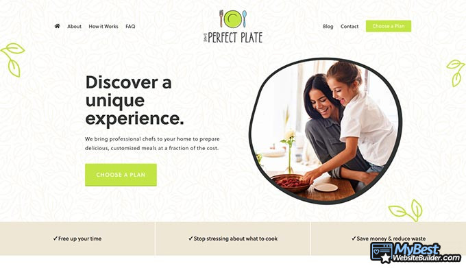 A Perfect Plate là một trong những website thực phẩm sử dụng mẫu website phổ biến hiện nay, nơi hầu hết các thông tin được trình bày trên trang chủ, với các chuyển tiếp hiện đại và trơn tru được đặt ở giữa mỗi phần khác nhau.